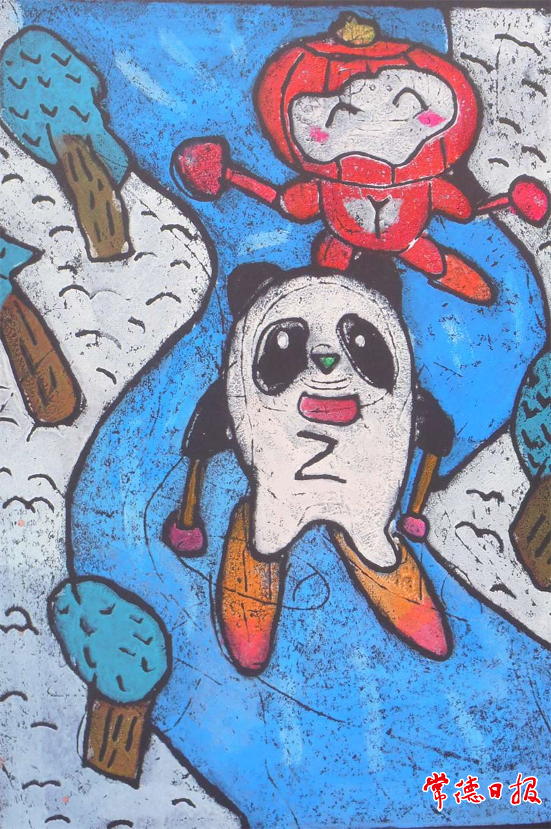 學(xué)生歐陽(yáng)章涵創(chuàng)作的版畫(huà)作品《酷炫冬奧》