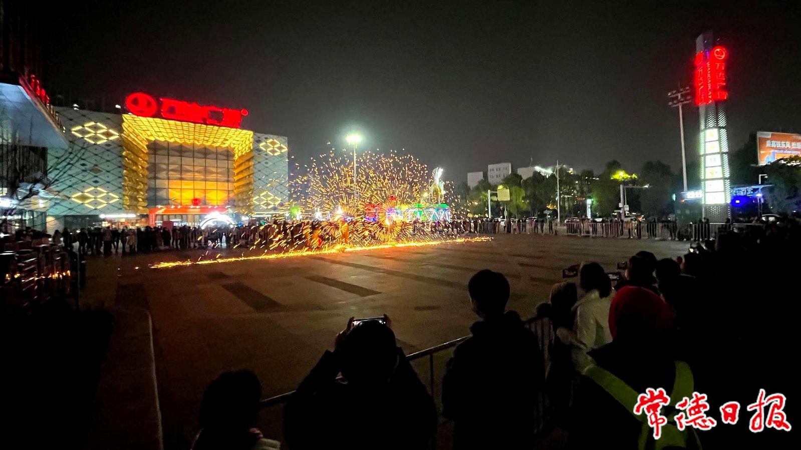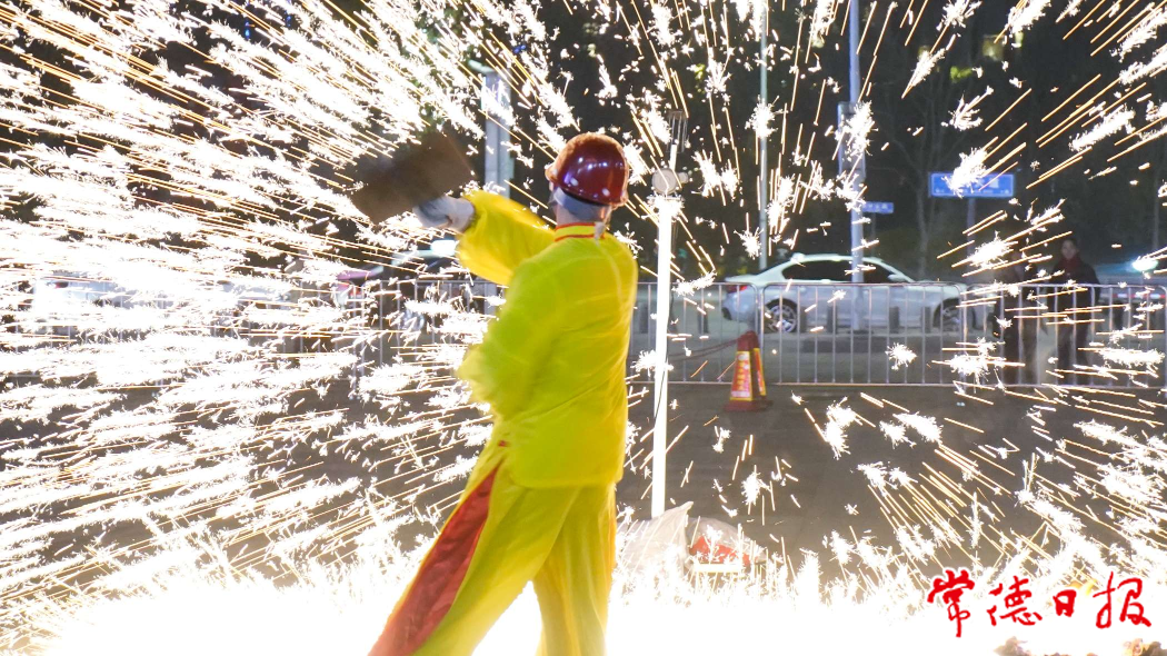 1月22日正月初一,常德武陵萬(wàn)達(dá)廣場(chǎng)前坪舉辦“千年非遺打鐵花”活動(dòng),1500度高溫的“鐵樹”上開滿了銀花,仿佛漫天繁星,每一秒都是震撼人心的夢(mèng)幻畫面?,F(xiàn)場(chǎng)觀眾拿出手機(jī)拍照發(fā)圈,整場(chǎng)活動(dòng)吸引近千人圍觀。