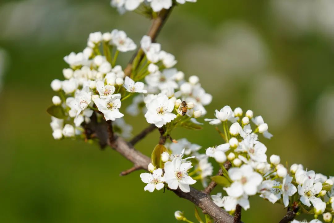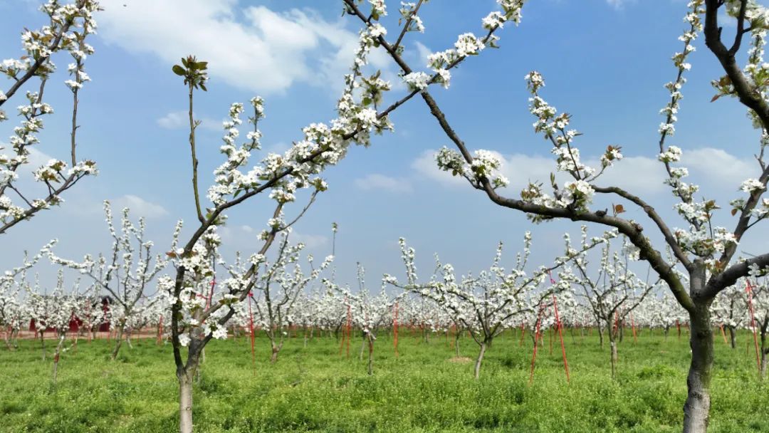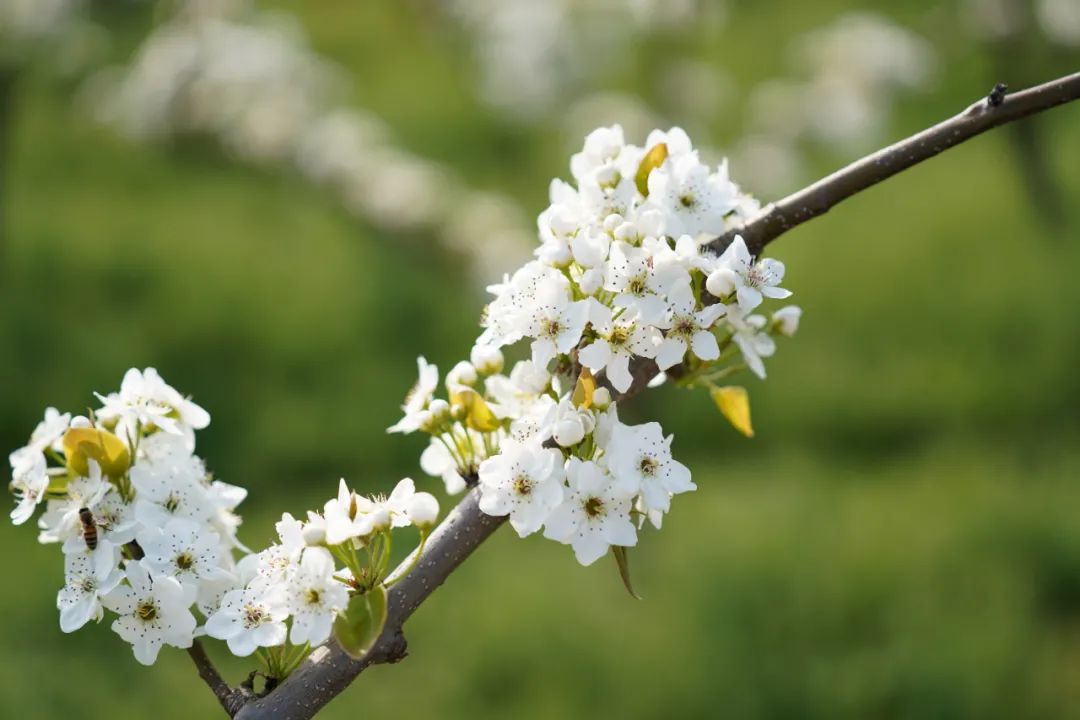 走進(jìn)裕民村的千畝楚峰梨園內(nèi),一樹樹、一叢叢梨花舒枝展葉、吐露芬芳。梨花開在枝頭,素潔淡雅,雪白欲滴。