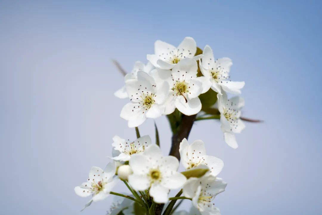 細(xì)看那一朵朵小花,散發(fā)著清香的花蕊點(diǎn)綴其中,互相掩映,互相依偎,柔嫩的花瓣薄如蟬翼。朵朵雪白的梨花隨著春風(fēng),輕輕搖曳生姿,暗香浮動(dòng),香雪紛飛,猶如在表演一曲輕快的春天圓舞。