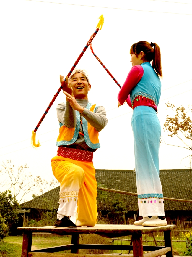 “九子鞭”因鞭子兩端各裝九枚銅錢而定名,九子鞭表演可一人獨打,雙人對打,也可群體表演,基本套式是蓮花八拍,分別用竹鞭拍打左右肩、左右手、左右腰、左右腳等八個部位,按此八拍延伸出六套模式,每套又分為八式,共四十八式,每式均有命名,“百鳥起舞”、“玉女纏腰”、“蝶舞花叢”、“靈猴舞鞭”等等,隨著竹鞭敲擊舞動,表演者做出單手拍、雙手舞花、盤繞等一系列動作,竹鞭發(fā)出富于節(jié)奏的“嚓嚓”聲,表演音樂伴以地方小調(diào),韻律節(jié)奏明快,舞姿粗獷優(yōu)美,令人目不暇接。