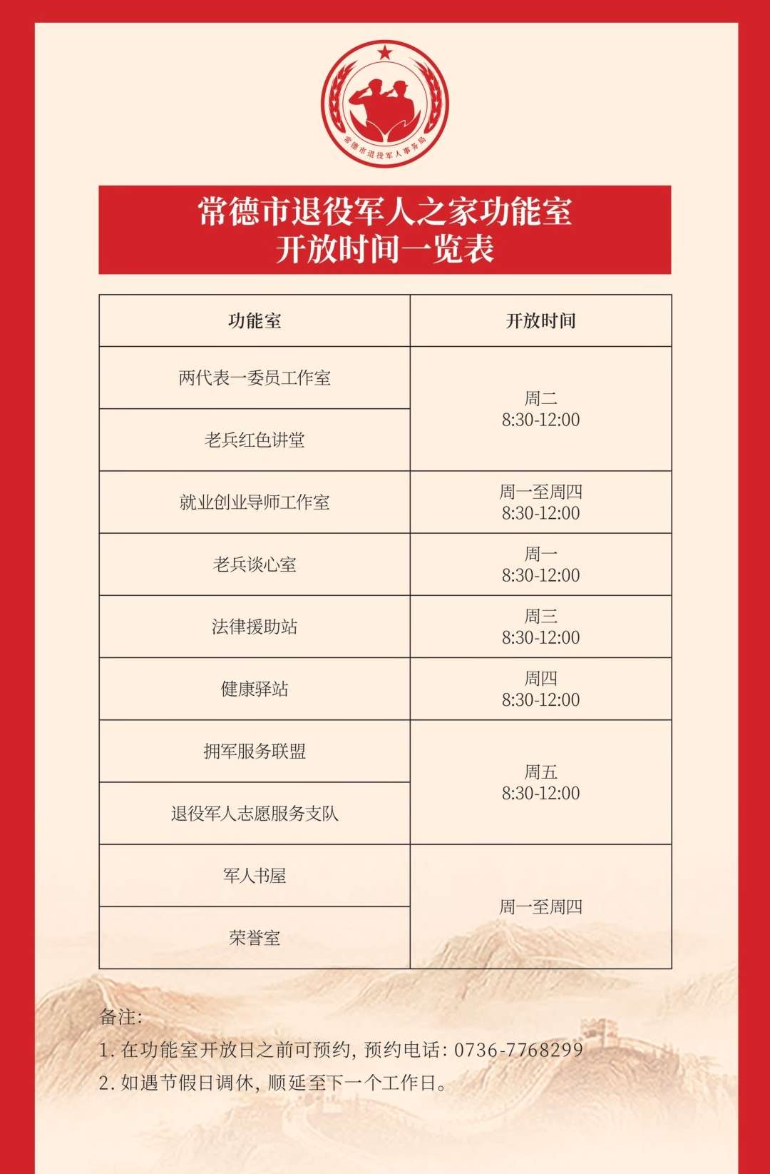 市退役軍人之家位于市退役軍人事務局辦公樓二樓,設置了“兩代表一委員”工作室、老兵談心室、就業(yè)創(chuàng)業(yè)導師工作室、老兵紅色講堂、法律援助站、擁軍服務聯(lián)盟、退役軍人志愿服務支隊、健康驛站、軍人書屋、榮譽室等10個功能室。市退役軍人之家聘請了部分黨代表、人大代表和政協(xié)委員,以及功臣模范、就業(yè)創(chuàng)業(yè)典型,法律、醫(yī)療專業(yè)服務人員等一批有情懷、熱心為退役軍人服務的社會各界人士組成的服務團隊,旨在通過活動開展,把退役軍人之家打造成為廣大退役軍人感情聯(lián)絡的紐帶、政策咨詢的窗口、信息溝通的渠道、就業(yè)幫扶的平臺。