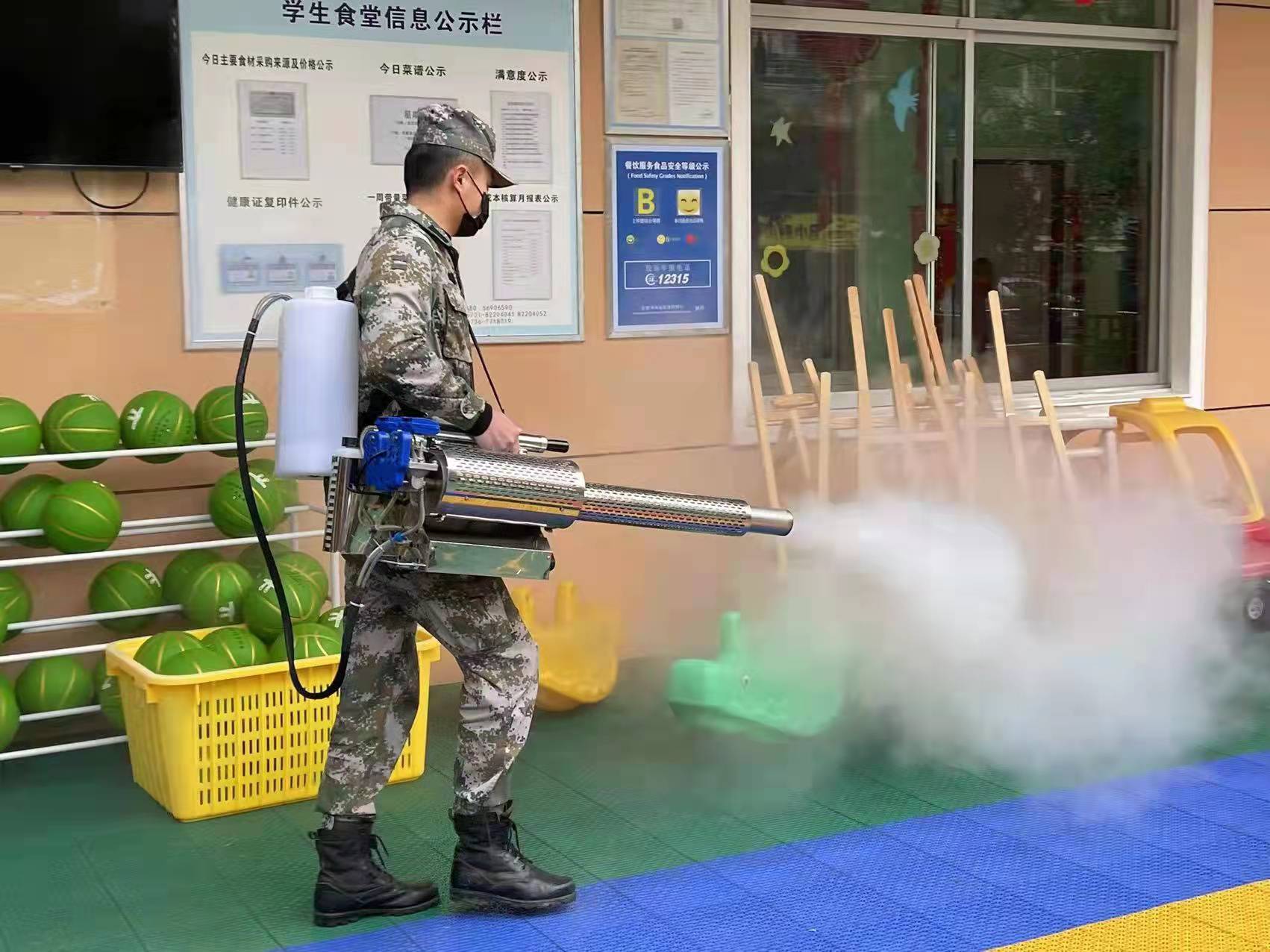 據(jù)劉貝介紹,近年來,“狼途”已為近5萬名青少年開展軍事課程培訓(xùn)、點(diǎn)對(duì)點(diǎn)的國(guó)防教育實(shí)踐活動(dòng)。公司發(fā)展前景一片大好,而這一切離不開學(xué)校師生們的支持。所以,他們一直想為孩子們做點(diǎn)什么。正值開學(xué)季,為了讓孩子們擁有一個(gè)健康、安全、干凈的校園環(huán)境,劉貝和同事決定對(duì)全市有需求的小學(xué)、幼兒園來一次大消殺。于是,劉貝火速購買了兩臺(tái)消毒機(jī),開始了他們的公益消殺之行?!靶』镒觽児ぷ魈貏e認(rèn)真,每一個(gè)角落他們都仔仔細(xì)細(xì)進(jìn)行消毒,這樣全覆蓋、無死角的消殺是送給小寶貝們返校最好的禮物?!毙」鹈勒Z幼稚園工作人員說道。