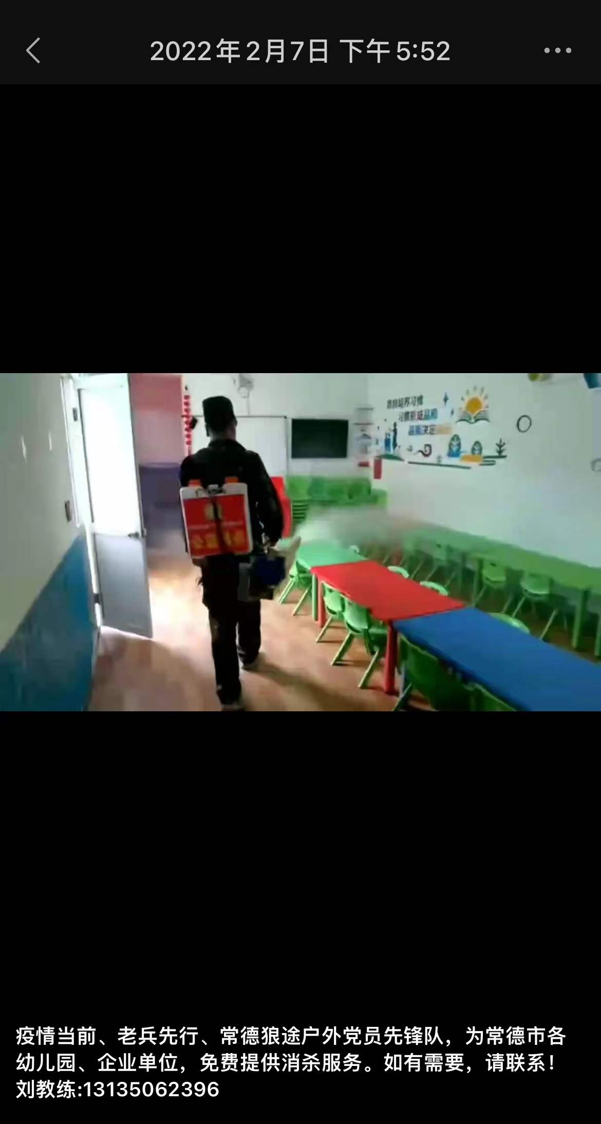 2月7日,一個(gè)名叫“狼途戶外”的微信號(hào)在朋友圈發(fā)布了一條消息,面向全市幼兒園、企事業(yè)單位進(jìn)行義務(wù)消殺服務(wù)。此條朋友圈一經(jīng)發(fā)布,引起了不少人的關(guān)注和點(diǎn)贊。一時(shí)間,數(shù)十家學(xué)校的工作人員聯(lián)系到該條信息的發(fā)布者,咨詢和申請(qǐng)消殺服務(wù)。而這個(gè)名叫“狼途戶外”的微信號(hào)使用者便是這一善舉的發(fā)起人——?jiǎng)⒇悺?/p>