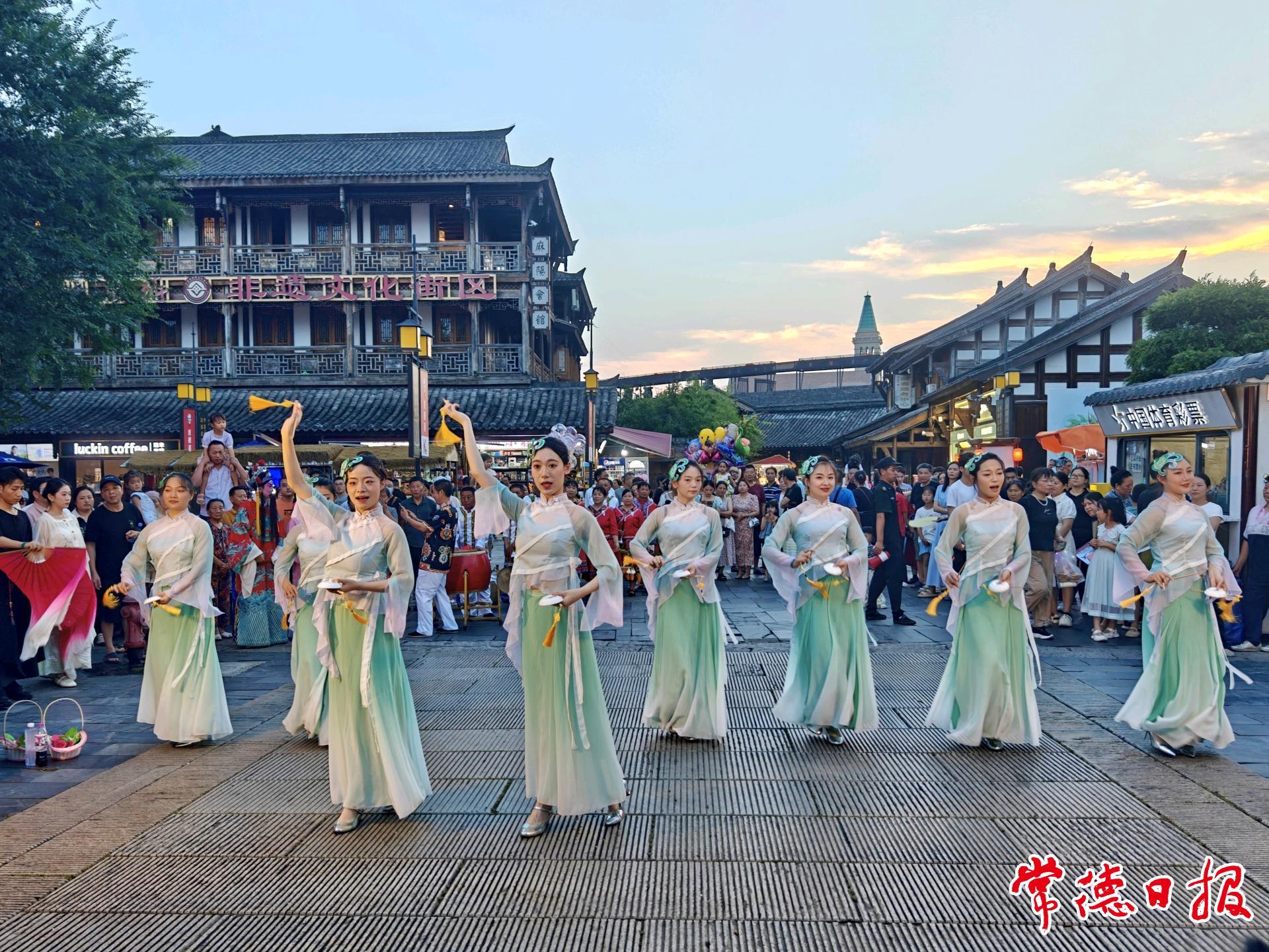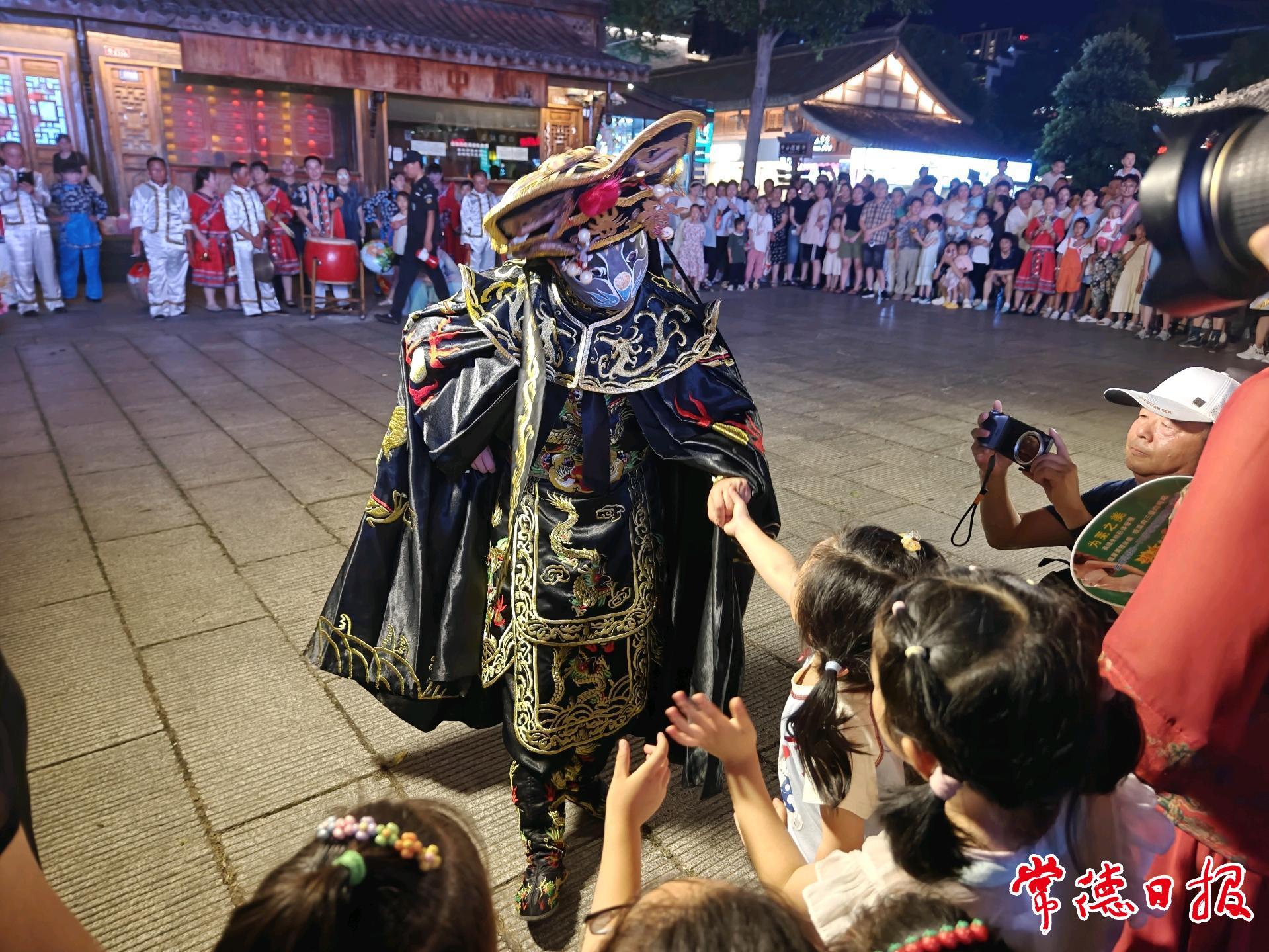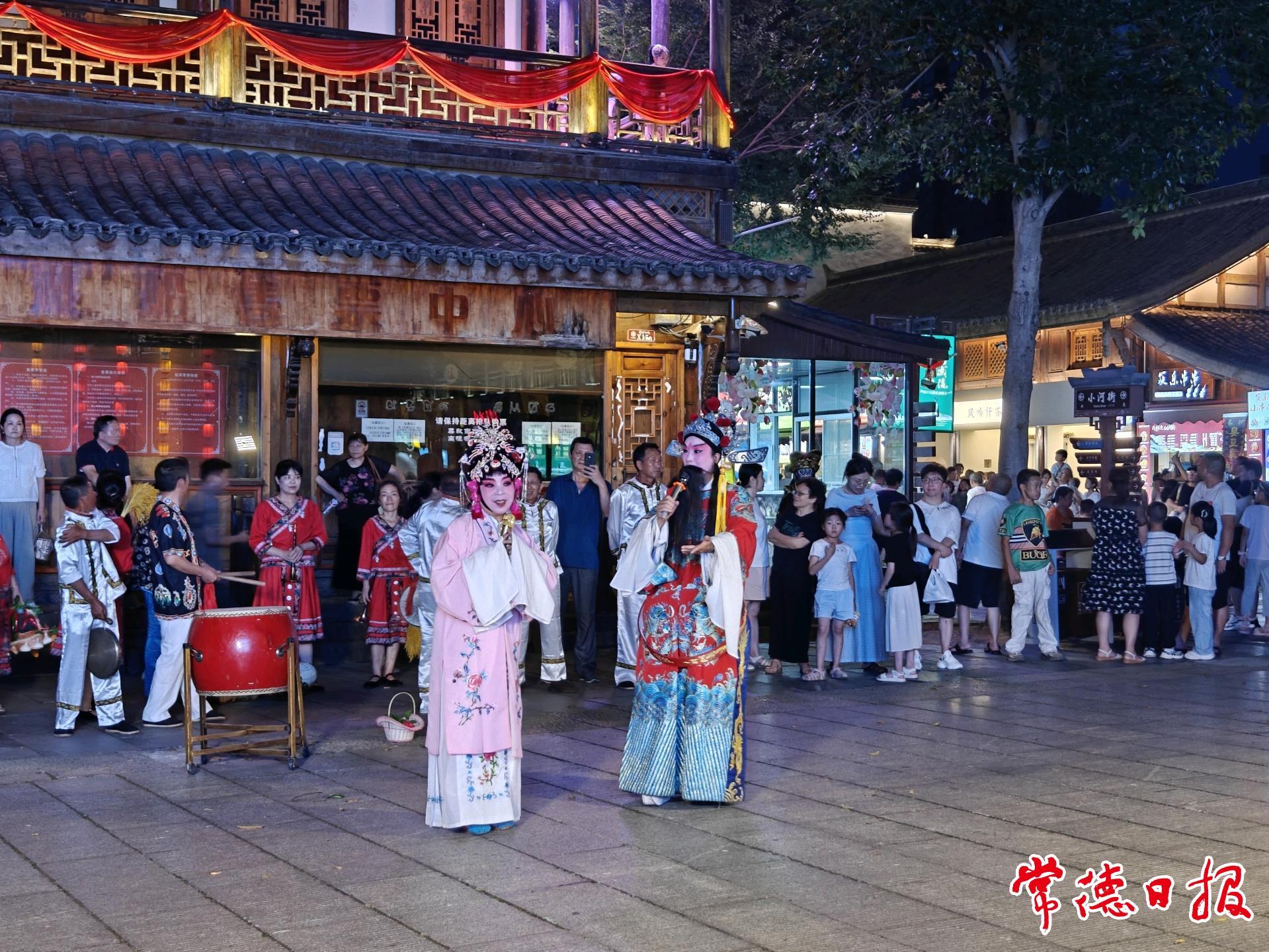 “常德是個好地方喲,伊兒喲伊兒喲……”19時15分,常德絲弦悠揚的唱腔拉開了展演的序幕。沒有固定舞臺,沒有明確界限,身著彩衣的演員們剛在神鼎門廣場亮相,就被熱情的觀眾團團圍住。手持自拍桿的游客踮起腳尖直播,孩童騎在父親肩頭興奮鼓掌,老人跟著韻律輕聲哼唱,掌聲喝彩隨著絲弦余韻在街巷間流淌。